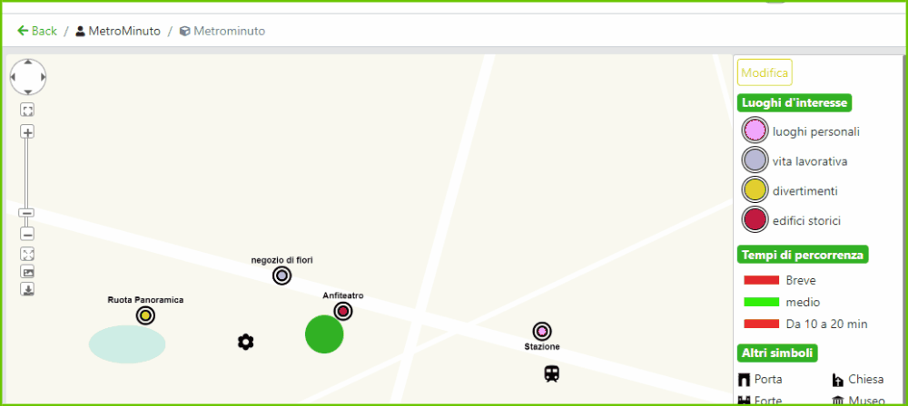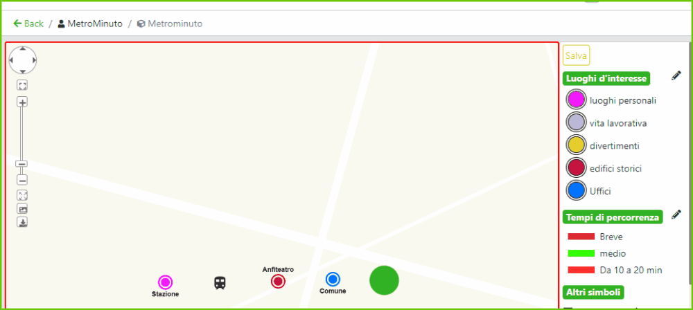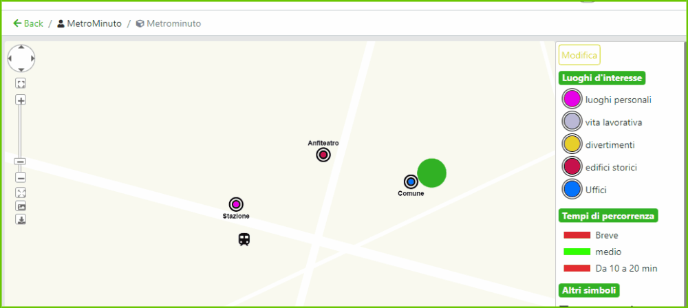 Il collegamento di due o più punti di interesse sulla mappa Metrominuto permette ai visitatori di scegliere di volta in volta l’itinerario preferito. Seleziona i punti che vuoi collegare, una volta salvate le modifiche verrà generata automaticamente una linea che unirà i due punti e assumerà una colorazione che indica la distanza ed i tempi di percorrenza a piedi sulla base dei criteri definiti nei tempi di percorrenza. I “POI” (così come le “SHAPE” e le “ICON”) potranno essere trascinati in qualsiasi punto della mappa, ciò non influirà sulla colorazione della linea che li collega.