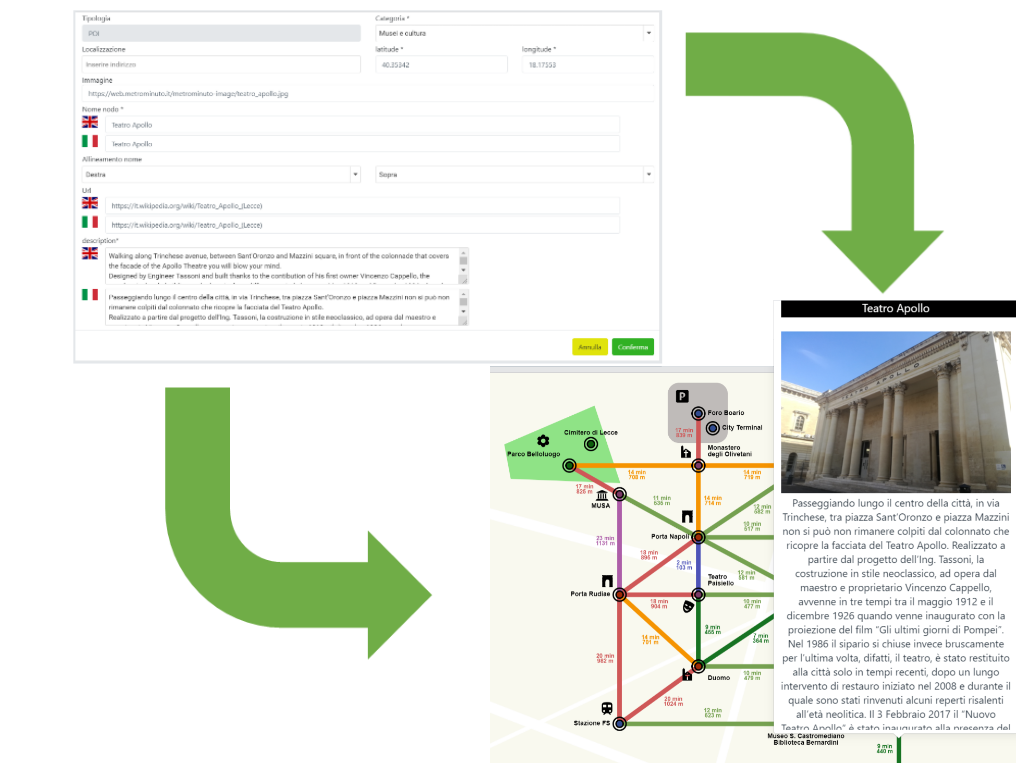 Ogni luogo di Interesse presente sulla metromappa può essere arricchito da contenuti che forniscano al visitatore informazioni esaustive sul luogo che intende visitare. Per prima cosa aggiungi il nome, la categoria e un’immagine del luogo. Successivamente, inserendo l’indirizzo, verrà rilevata la latitudine e la longitudine del luogo, questo farà si che la distanza tra i punti di interesse, i tempi di percorrenza a piedi e la relativa colorazione della linea che li congiunge venga generata automaticamente sulla base delle impostazioni precedentemente scelte. Molto importante sarà inserire una breve descrizione del luogo, magari corredandola con orari di apertura, informazioni di contatto e altri link utili. Abbi cura infine di redigere i contenuti anche in lingua Inglese per far sì che anche i visitatori stranieri possano apprezzare i vantaggi dell’utilizzo della tua mappa.